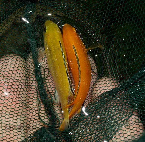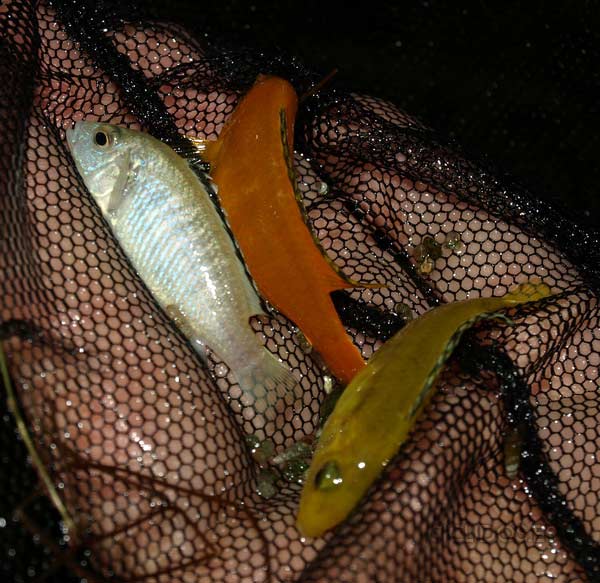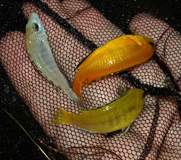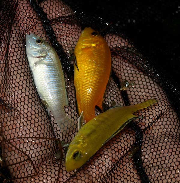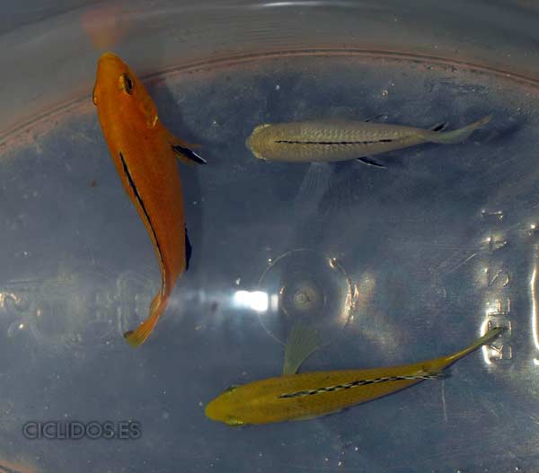 En estas fotografias se pueden ver las diferencias cromaticas de tres de las diferentes variedades de Labidochromis caeruleus:
