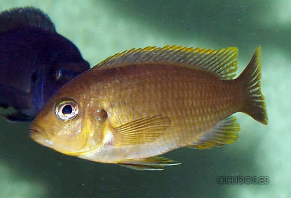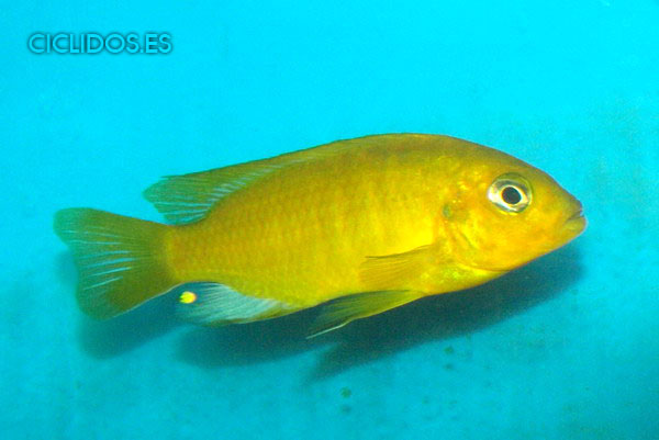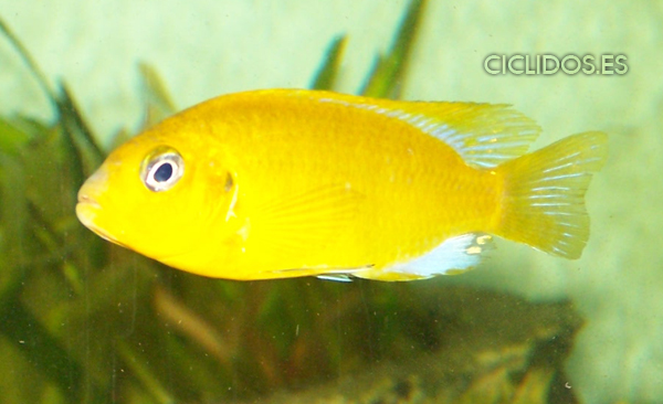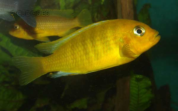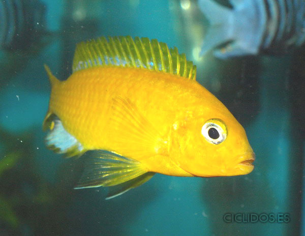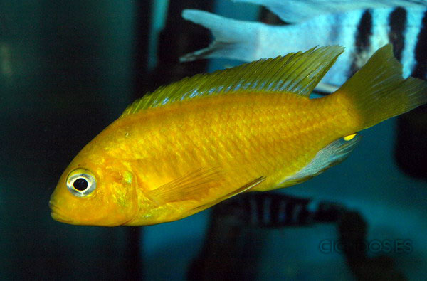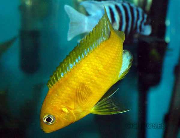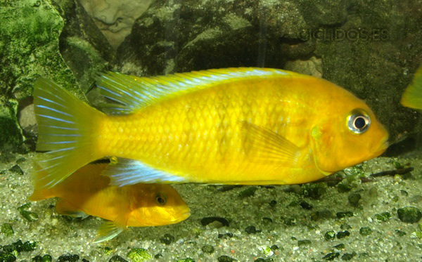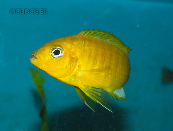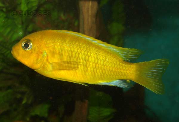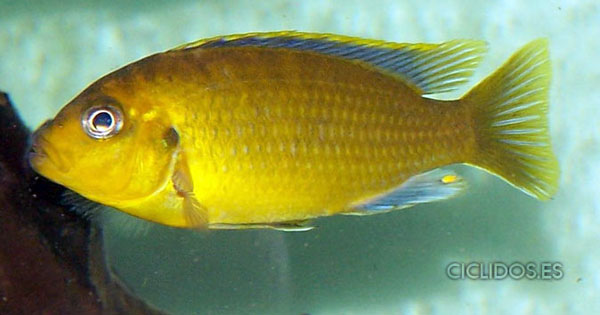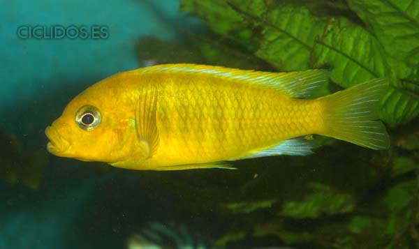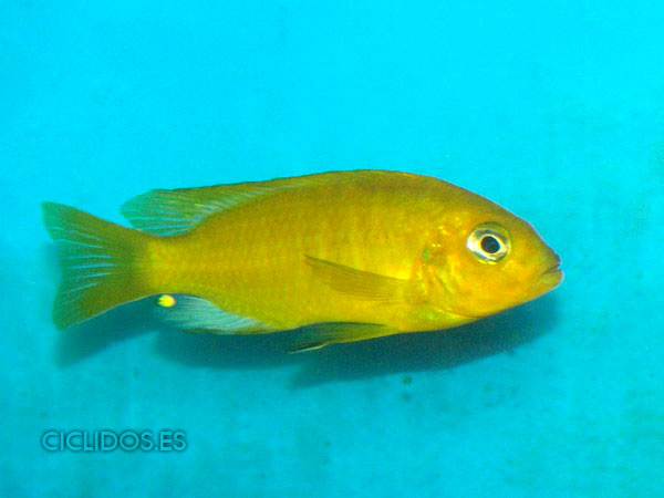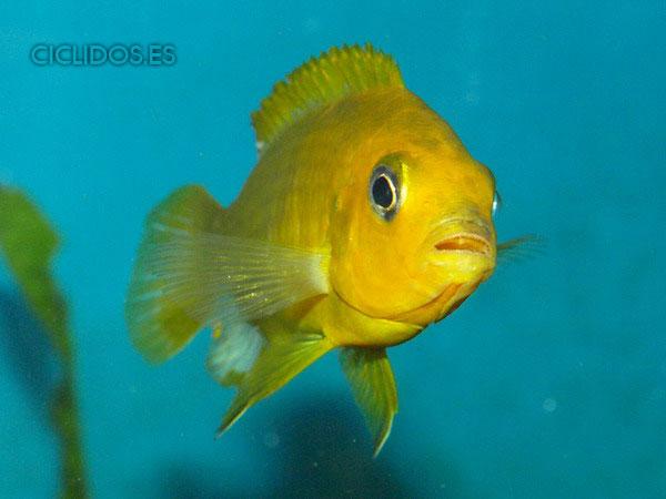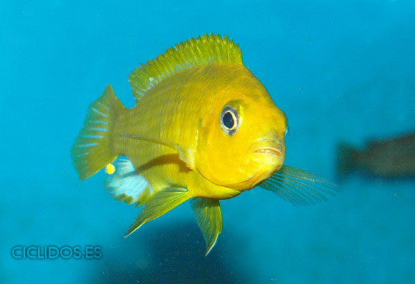 Los machos son de color amarillo- naranja, con parte de las aletas dorsal anal y caudal en color azul.