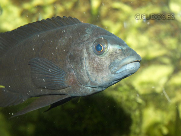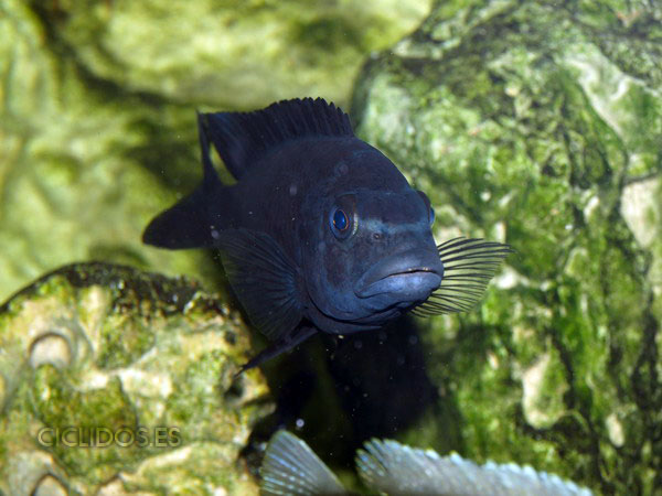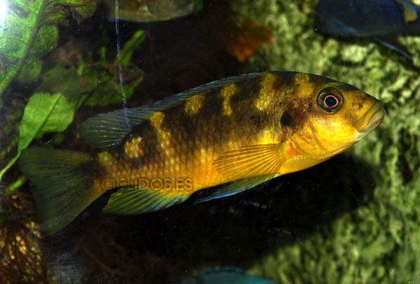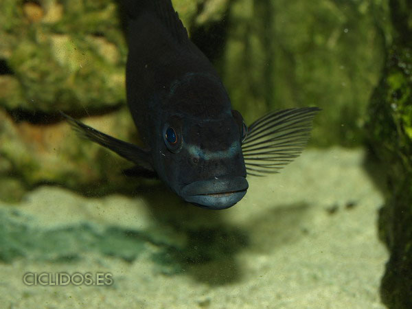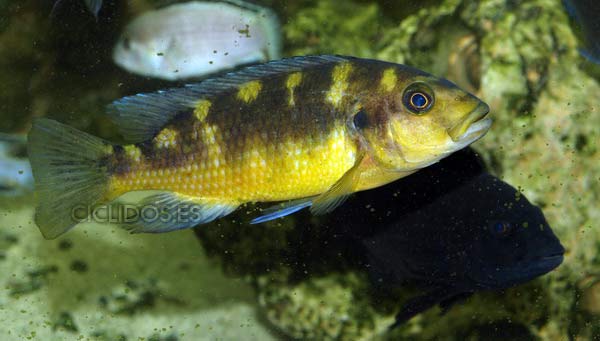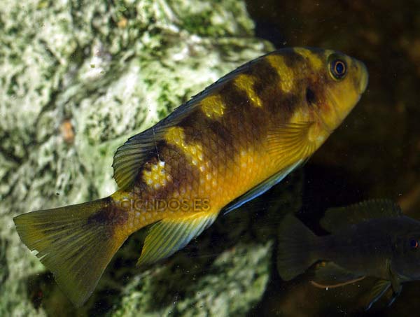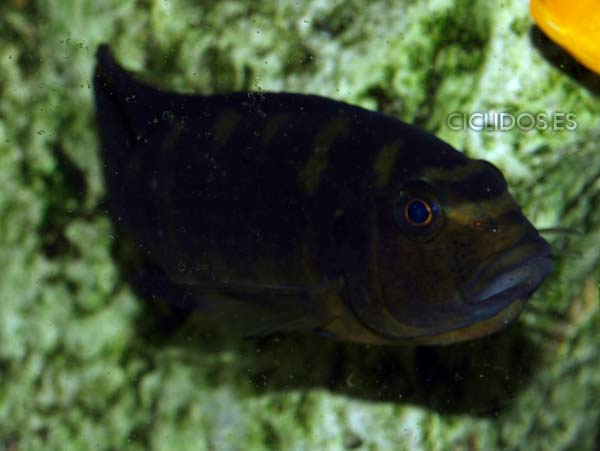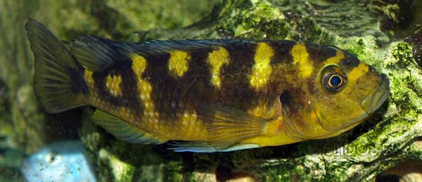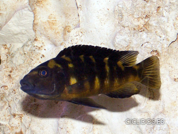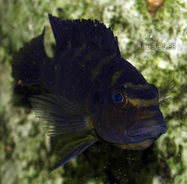 Los machos territoriales son de color negro, a veces con puntos azules, así como las hembras, son de color amarillo con grandes barras marrones-negras. Los machos tienen una aleta anal con varios ocelos. Las hembras no poseen ocelos normalmente.