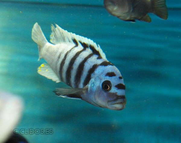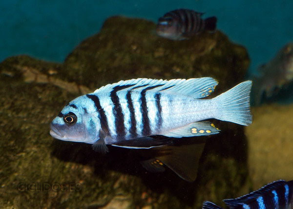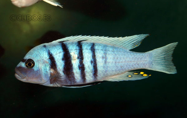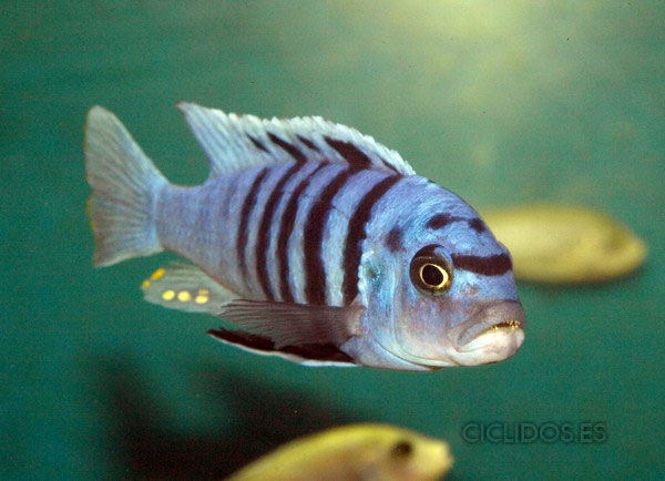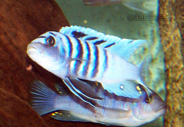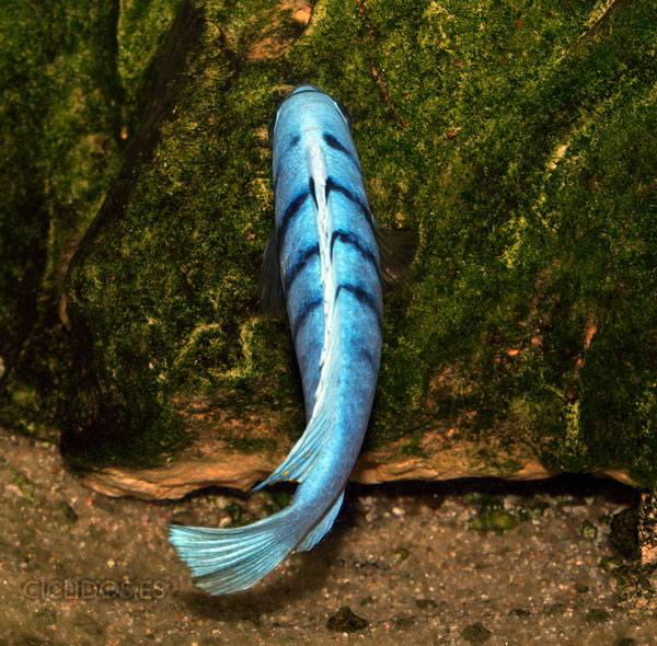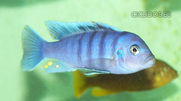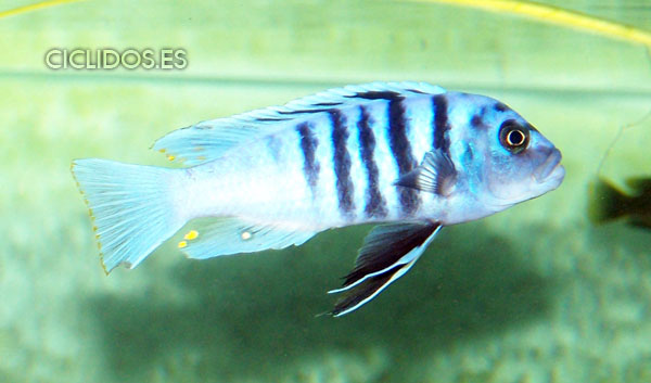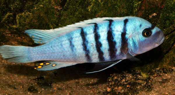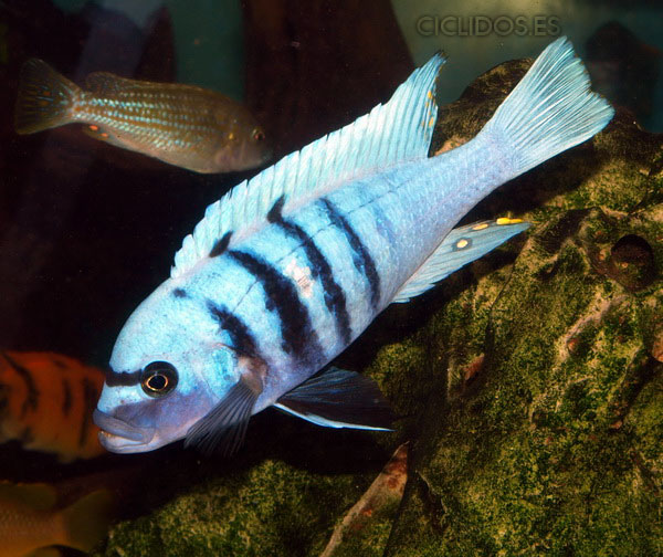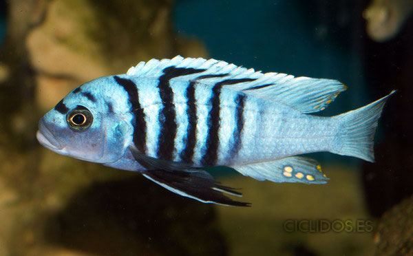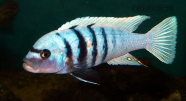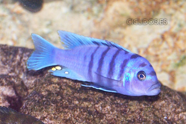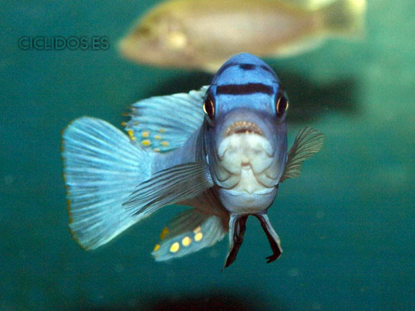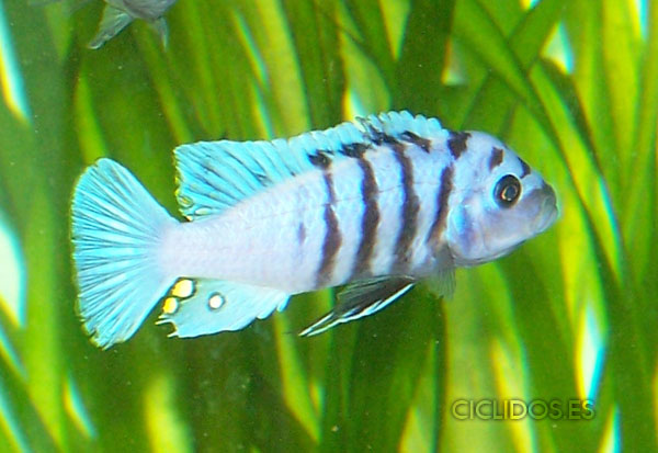 Es su coloración lo que lo hizo famoso y popular de inmediato para el acuario. El macho dominante es un hermoso azul cobalto, el cuerpo compuesto de cuatro a cinco barras visibles, las últimas dos o tres barras van perdiendo intensidad hasta desaparecer. Una banda negra que va desde un ojo al otro forma una característica forma de máscara. Las pélvicas son de color negro con una línea blanca en la parte delantera. El macho tiene varios ocelos en la aleta anal y al final de la dorsal. Los individuos dominados pierden intensidad en las barras y el azul del cuerpo se vuelve menos brillante. Las hembras a veces pueden mostrar los colores del macho dominante en determinadas circunstancias.