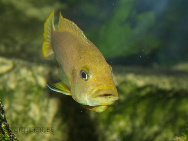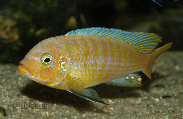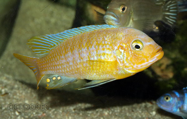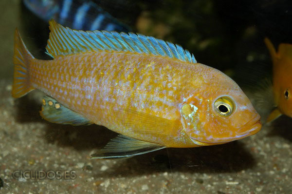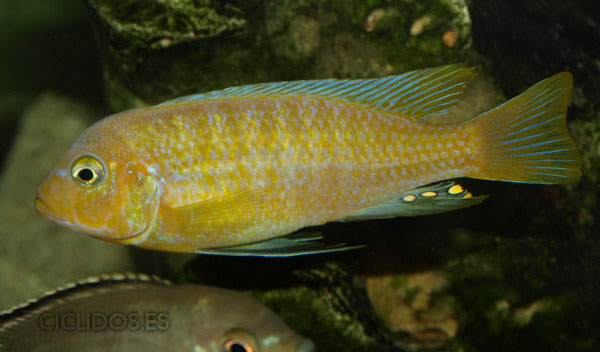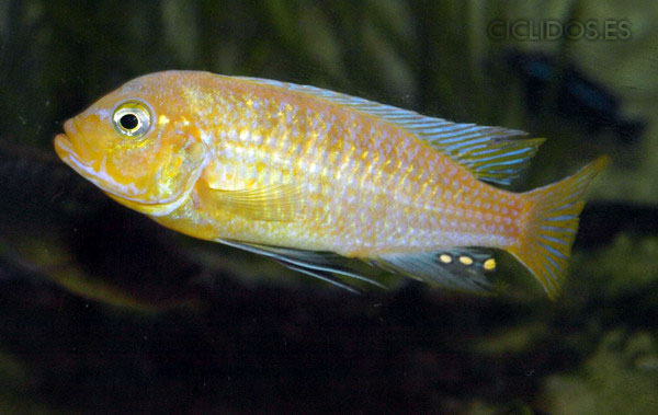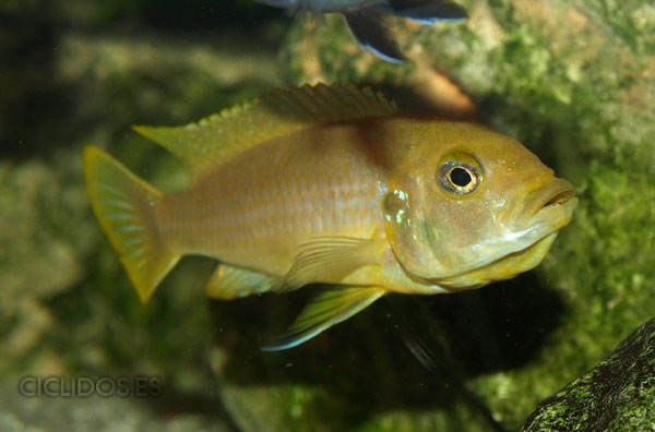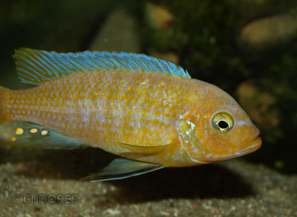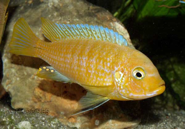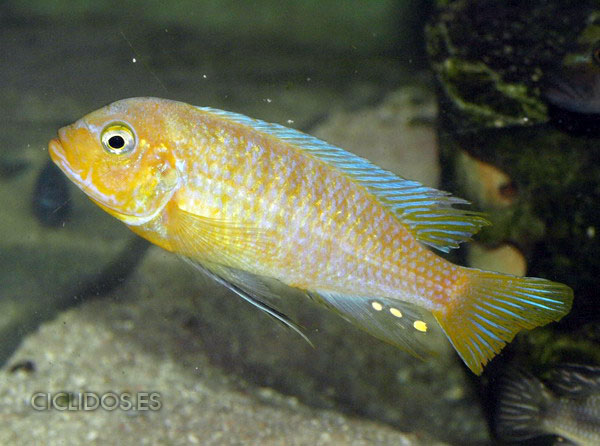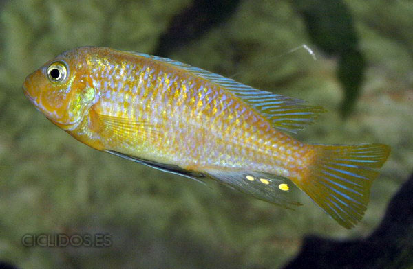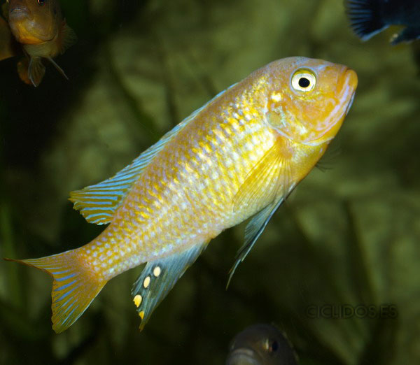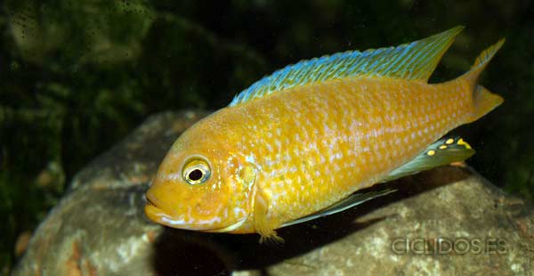 Los machos son de color amarillo a amarillo dorado, de color azulado en la parte frontal de cabeza y la aleta dorsal. La distribución del color azul es diferente en cada individuo.