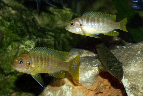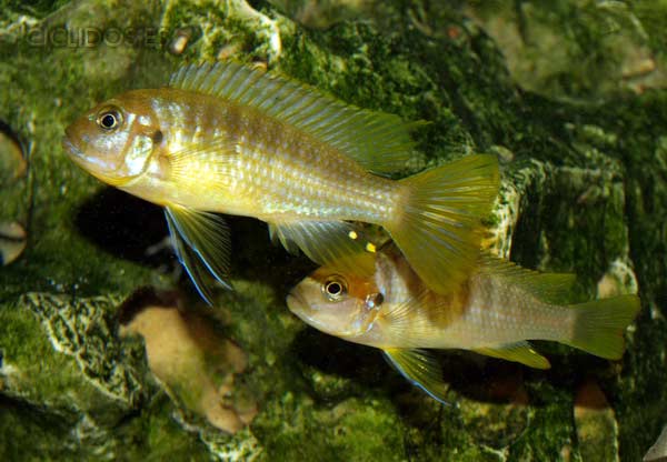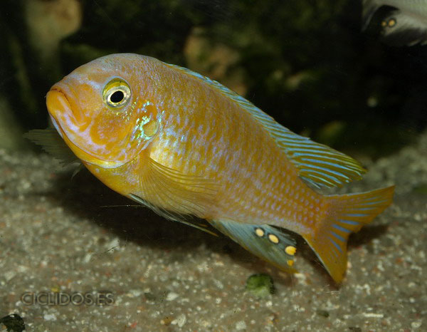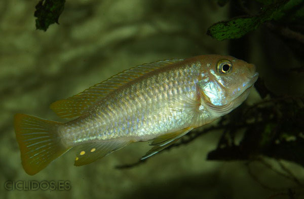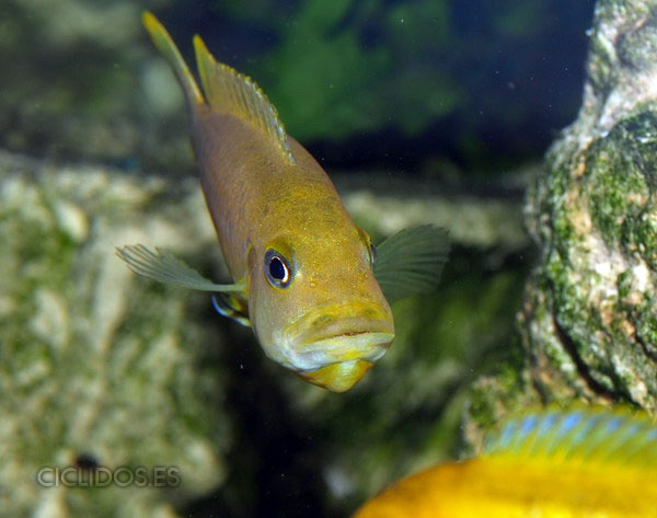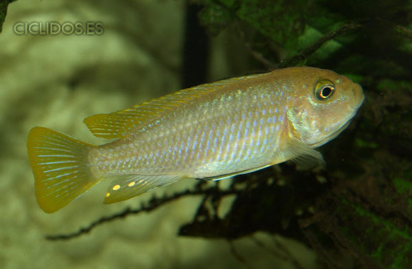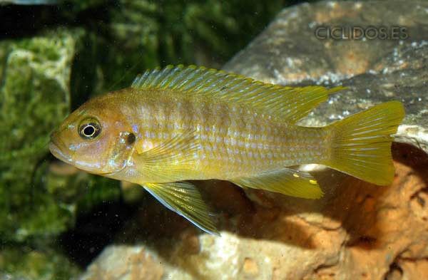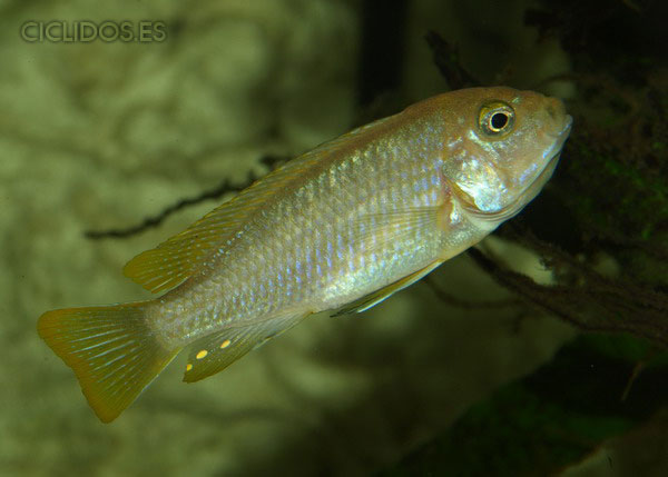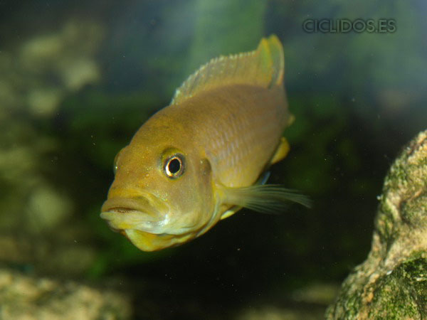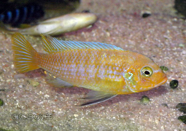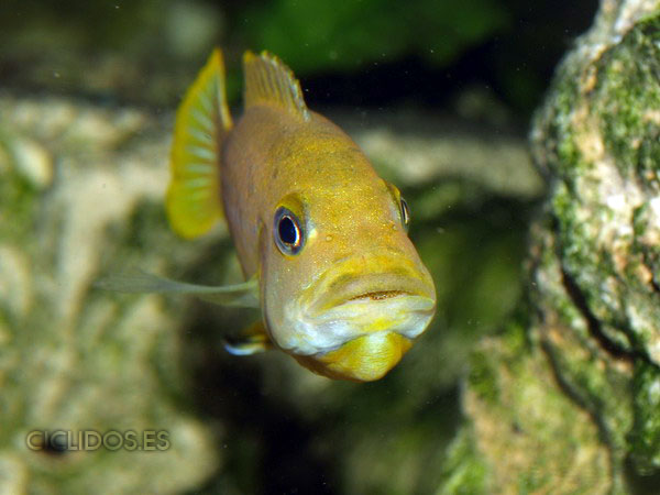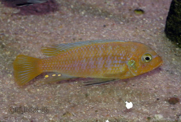 Los machos son de color amarillo a amarillo dorado, de color azulado en la parte frontal de cabeza y la aleta dorsal. La distribución del color azul es diferente en cada individuo.