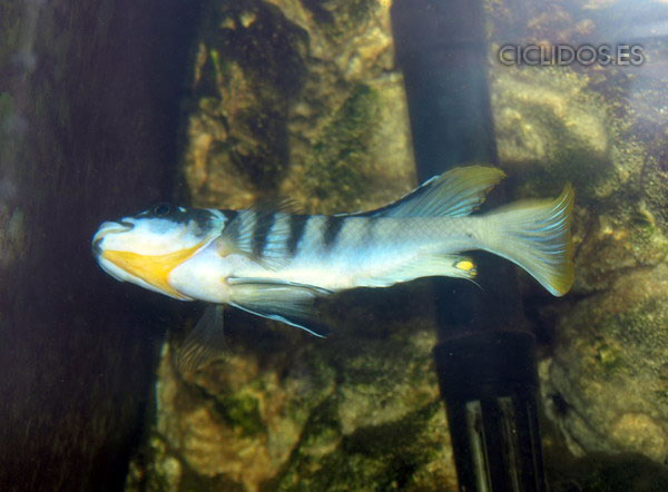 Los machos adultos son rayados en blanco azulado y negro con una garganta amarilla, así como también tiene amarillo al final de la aleta dorsal y la cola. Los machos presentan unas alargadas aletas pélvicas. Las hembras algo más monótonas tienen un color marrón grisáceo, aunque algunas hembras en periodo de incubación pueden marcar rayas distintivas.