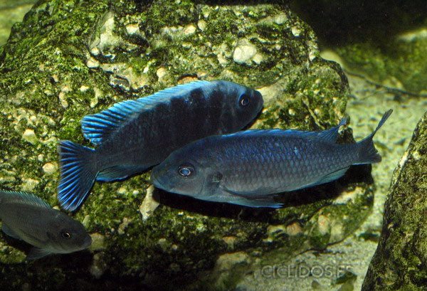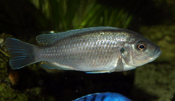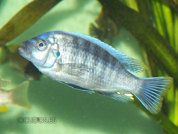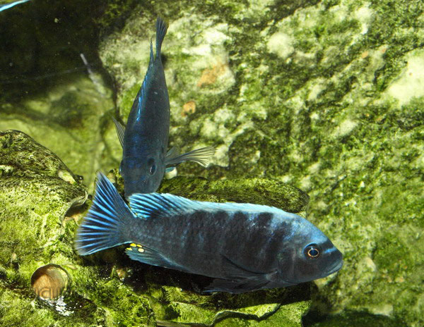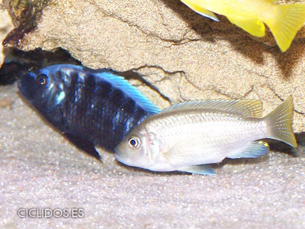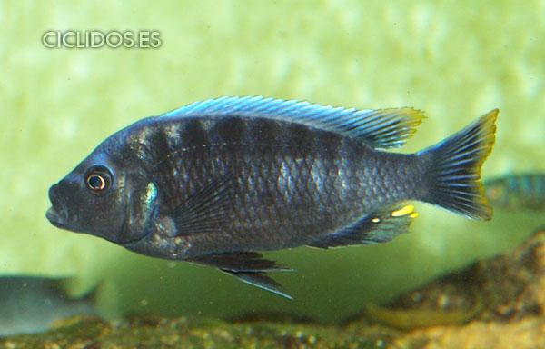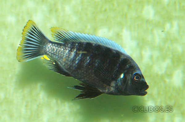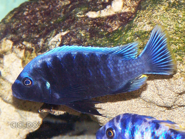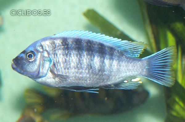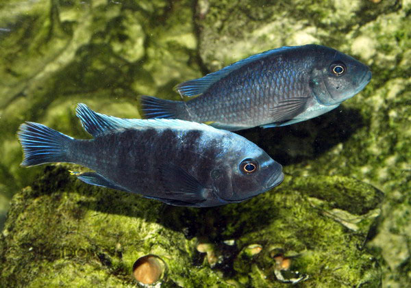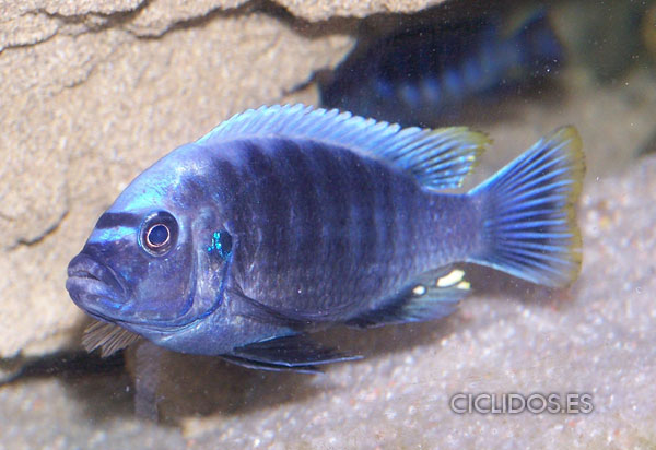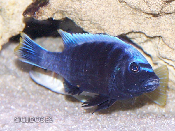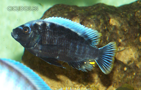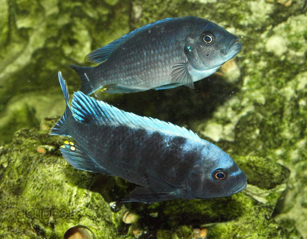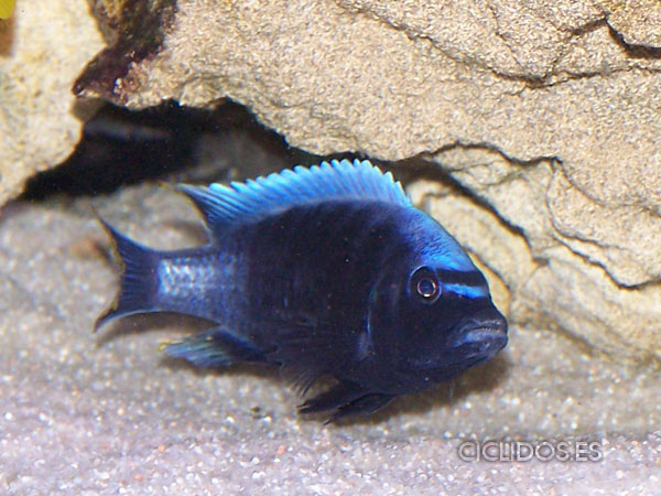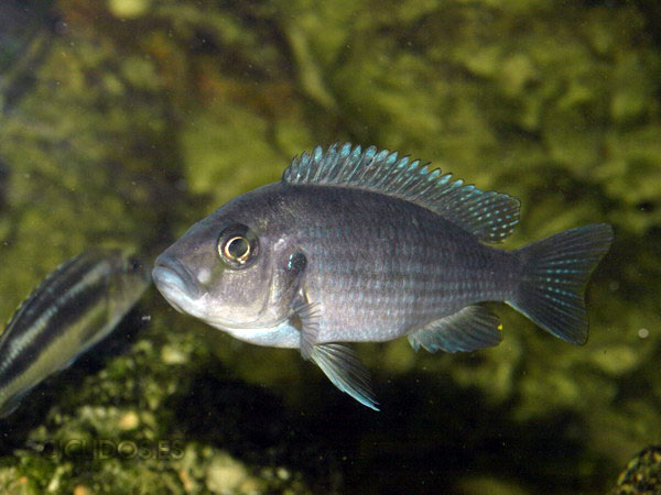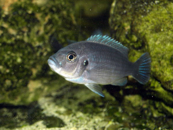 Las hembras son color plata mientras que los machos son negros con una mancha azul claro en la parte superior que se extiende de la cumbre del cráneo hasta la extremidad de la aleta dorsal. En la naturaleza las hembras y los machos territoriales son encontrados juntos donde constituyen grupos de reproducción. La zona predilecta de este pez es la frontera de la zona rocosa del lago.