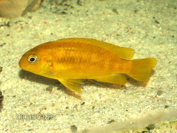 La hembra es de color amarillo-naranja y tiene en el lateral una fila de rayas (apenas visibles) característica de la especie Chilumba.