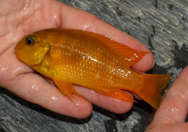 Alcanza de adulto 12 centímetros, la hembra sobre 9 cm.