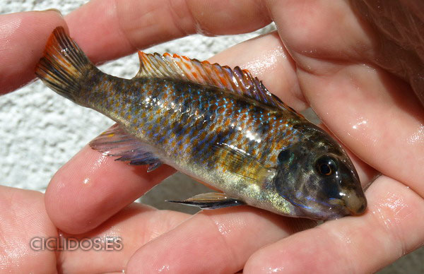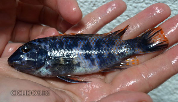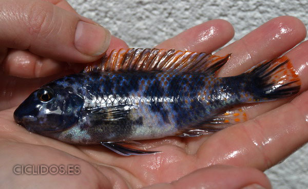 El macho de esta variedad es azul, con algunas rayas verticales algo más oscuras, con una máscara negra cuando esta excitado en la que destacan dos franjas negras horizontales por encima de la boca, todas sus aletas tienen los bordes naranjas, destacando la dorsal con un fuerte naranja brillante. Las hembras son naranjas, con manchas negras de posición y tamaño variable en cada ejemplar. Dentro de esta población se pueden encontrar en los mismos grupos individuos OB tanto machos como hembras, son de color naranja con manchas negras y reflejos azules, los machos conservan el color de la característica aleta dorsal naranja de la variedad de thumbi west, también hay machos del color de las hembras, la variedad O, que es de color naranja marcando en la aleta dorsal un naranja brillante lo que le hace destacar respecto a las hembras de similar coloración.